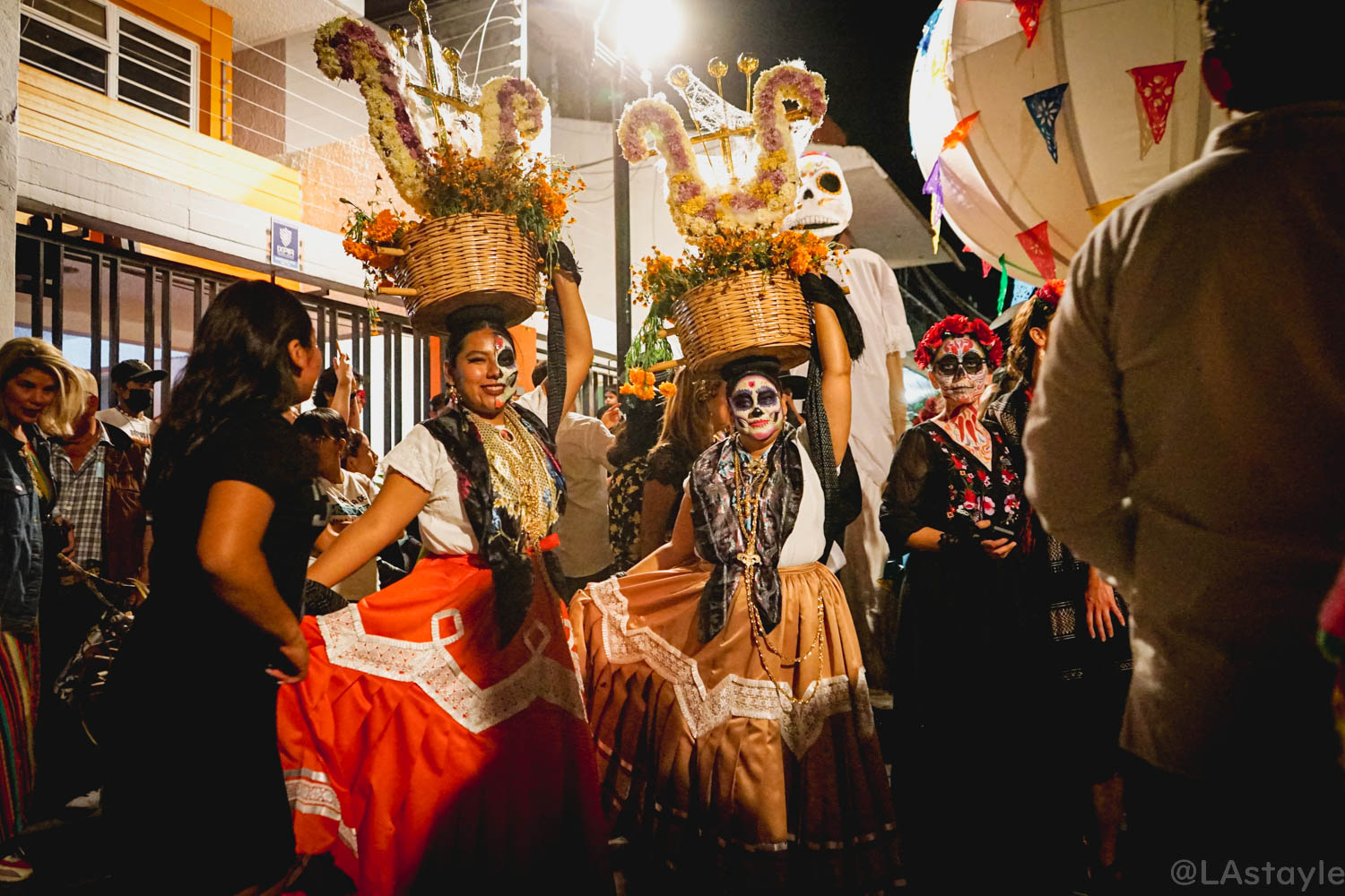 夜が深まればなるほど人が増え、もう街中はお祭り騒ぎ。「死者の日」は11月1日、2日がメインになるが、夜はパレードも行われていた。